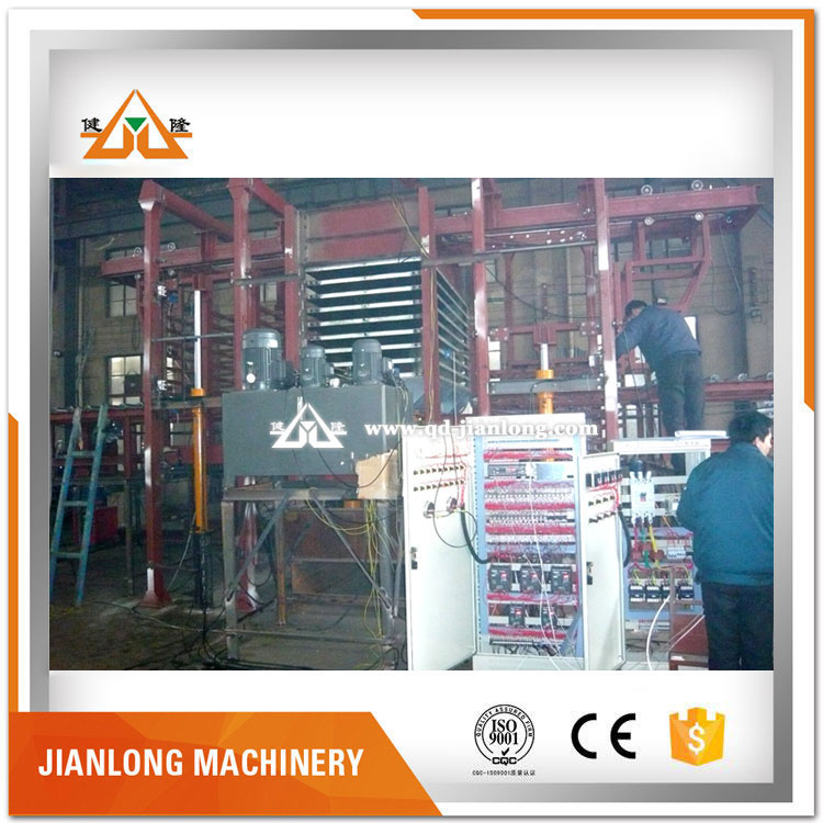 進出料生產(chǎn)線熱壓機進板架配置于多層熱壓機進板側(cè), 熱壓機出板架配置于多層熱壓機出板側(cè), 熱壓機進板架用于將涂膠預(yù)壓后的板坯送入多層熱壓機,并將熱壓后的板坯推出多層熱壓機送入熱壓機出板架, 熱壓機出板架用于存放熱壓后的板坯進行冷卻,是多層膠合板、箱板生產(chǎn)線中配套輔助設(shè)備之一。其特點:熱壓機進板架采用定點裝板,移動進板,可同時與多臺相同規(guī)格的熱壓機配套,安裝調(diào)試方便,操作簡單,減少熱壓機操作配置人員,減輕勞動強度。